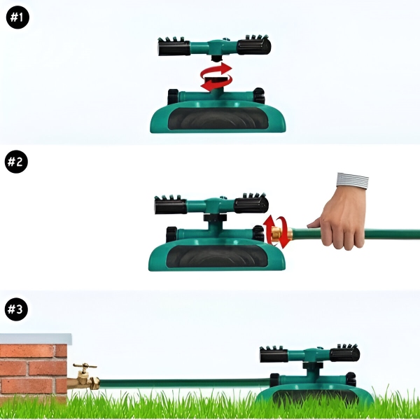 Prijunkite ROTOSPRITZ prie žarnos jungties ir maišytuvo, pritvirtinkite įžeminimo kaištį prie žolės ir mėgaukitės moksliškai efektyvia drėkinimo sistema. Dėl 360 laipsnių sukimosi užtikrinamas tolygus laistymas be pavojaus perlieti augalus.