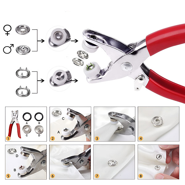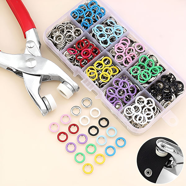 Šiame rinkinyje yra viskas, ko reikia: patvarios replės, 80 įvairių spalvų aukštos kokybės metalinių užspaudžiamų sagų ir kompaktiškas dėklas.