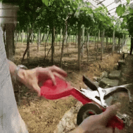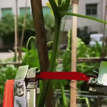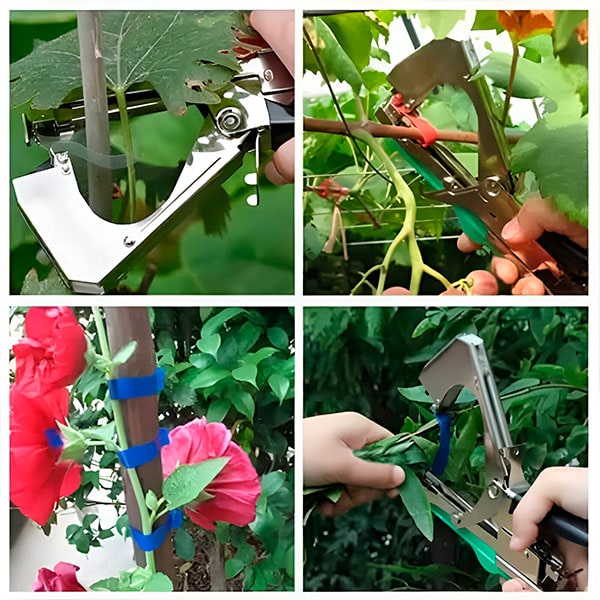 Tiesiog paspauskite rankenėlę, kad ištemptumėte dirželį tarp žnyplių. Tada juosta apvyniojama aplink augalą, kurį norite surišti. Dar kartą paspauskite rankeną, kad priveržtumėte ir perkirptumėte juostelę. Labai lengva! – Nesijaudinkite, kad sugadinsite augalus ar sužeisite augalus, nes juosta ir segiklis švelniai, bet tvirtai suima.