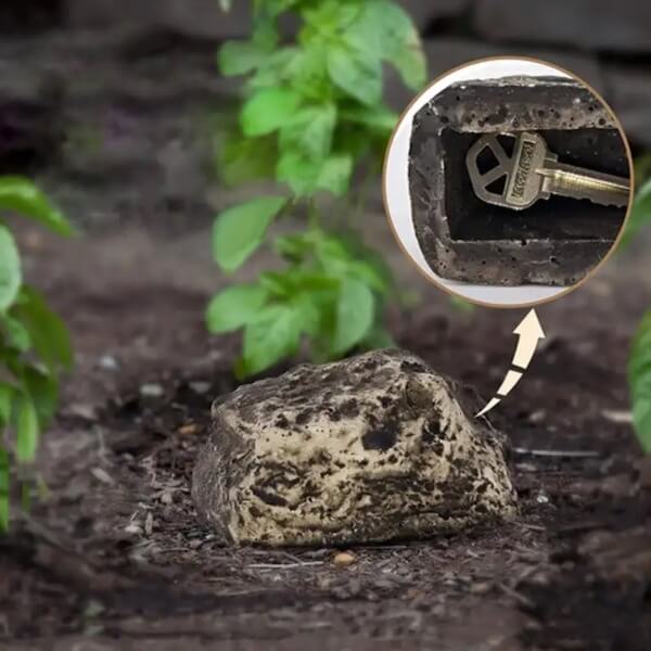 Šis akmens formos raktų laikiklis puikiai įsilieja į lauko aplinką, užtikrindamas, kad jūsų raktas išliks saugus ir paslėptas.